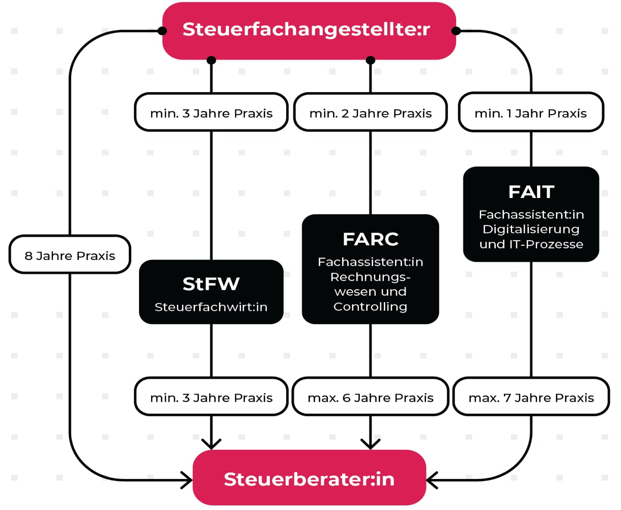 Das muss nicht das Ende sein. Es gibt verschiedene Fortbildungsmöglichkeiten, zum Beispiel zum Fachassistenten/zur Fachassistentin, zum/zur Steuerfachwirt:in oder sogar zum/zur Steuerberater:in – ganz ohne Studium!